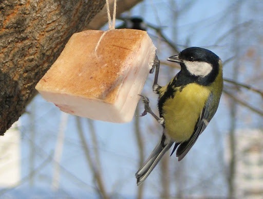 Сало (свиняче, курячий, або яловичий жир)повинне бути не солоне, краще нутряне. Його можна накришити в годівницю, а можна повісити на гілку дерева. Це буде хороший корм для синиці, сойки, повзика, ворони, галки і сороки.